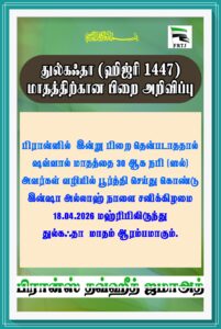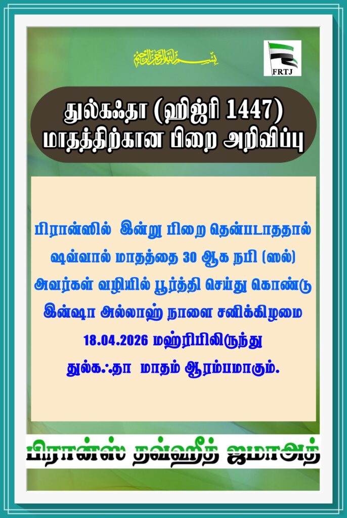 செய்து கொண்டு இன்ஷாஅல்லாஹ் நாளை (18/04/26)சனிக்கிழமை மக்ரீஃப் பின் துல்கஃதா மாதம் ஆரம்பம் ஆகும்.என்பதை பிரான்ஸ் தவ்ஹீத் ஜமாஅத் தெரிவித்துக்கொள்கின்றது.