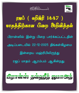பிரான்சில் ரஜப் மாதத்திற்கான பிறை தேட வேண்டிய நாளான (22/12/2025) திங்கட்கிழமை இன்று மக்ரீஃப்பிறகு ரஜப் மாதத்தின் பிறை தென்பட்டதின் அடிப்படையில் இன்றைய மக்ரீஃப்லிருந்து ரஜப் மாதம் ஆரம்பம் ஆகின்றது என்பதை FRTJ நிர்வாகம் தெரிவித்துக் கொள்கின்றது.