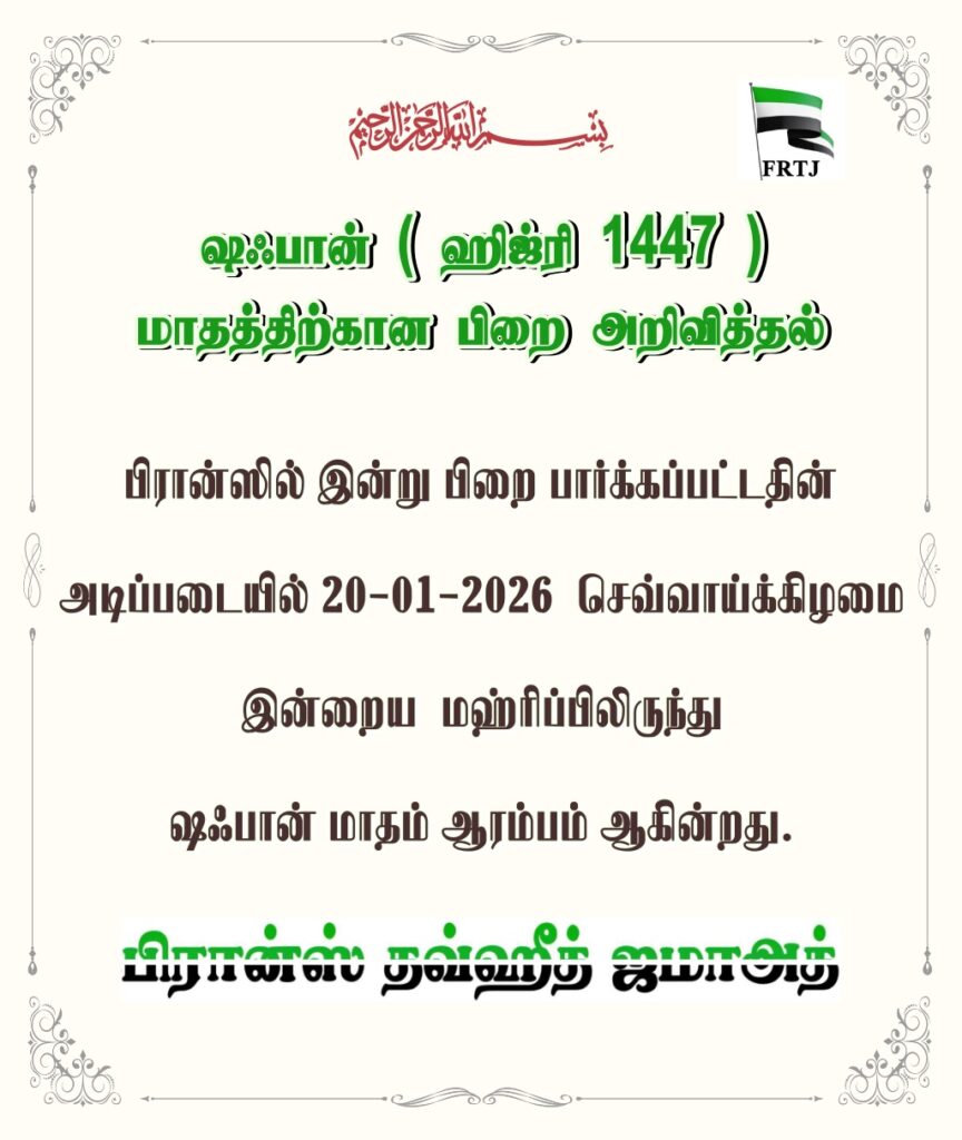 பிரான்ஸில் ஷஃபான் மாதத்திற்கான பிறை தேட வேண்டிய நாளான (20/01/2026) செவ்வாய்கிழமை இன்று பிறை தென்பட்டதின் அடிப்படையில் இன்றைய மக்ரீஃப்லிருந்து ஷஃபான் மாதம் ஆரம்பம் ஆகின்றது என்பதை FRTJ நிர்வாகம் தெரிவித்துக் கொள்கின்றது.